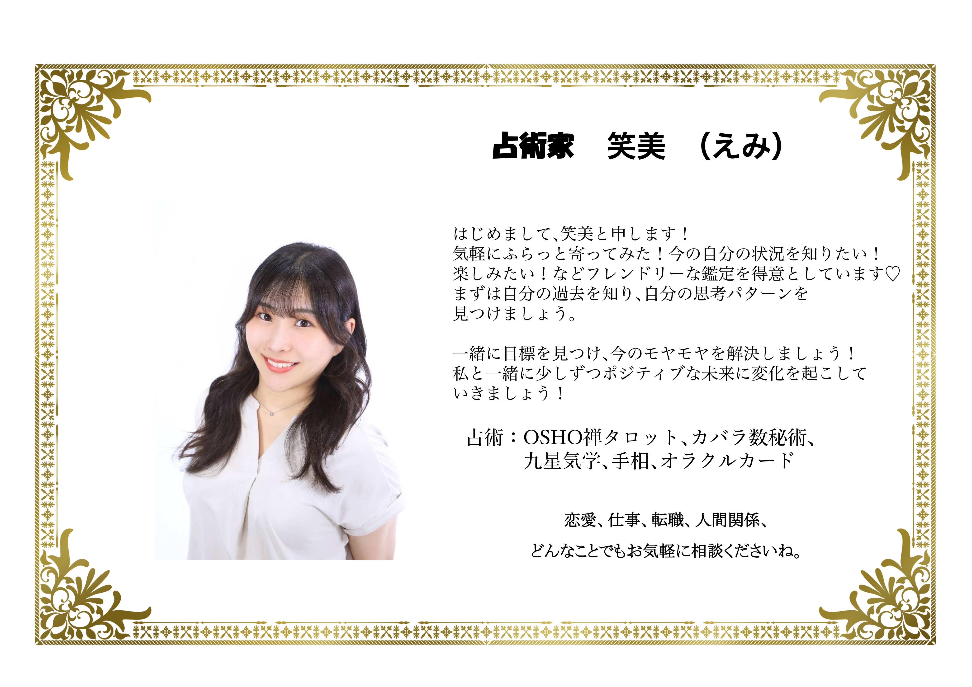 いつでも笑顔で鑑定!タロットやオラクルカードからの優しいメッセージを元気に明るくお伝えしております。もちろん、辛いお悩みにもしっかりと寄り添います。