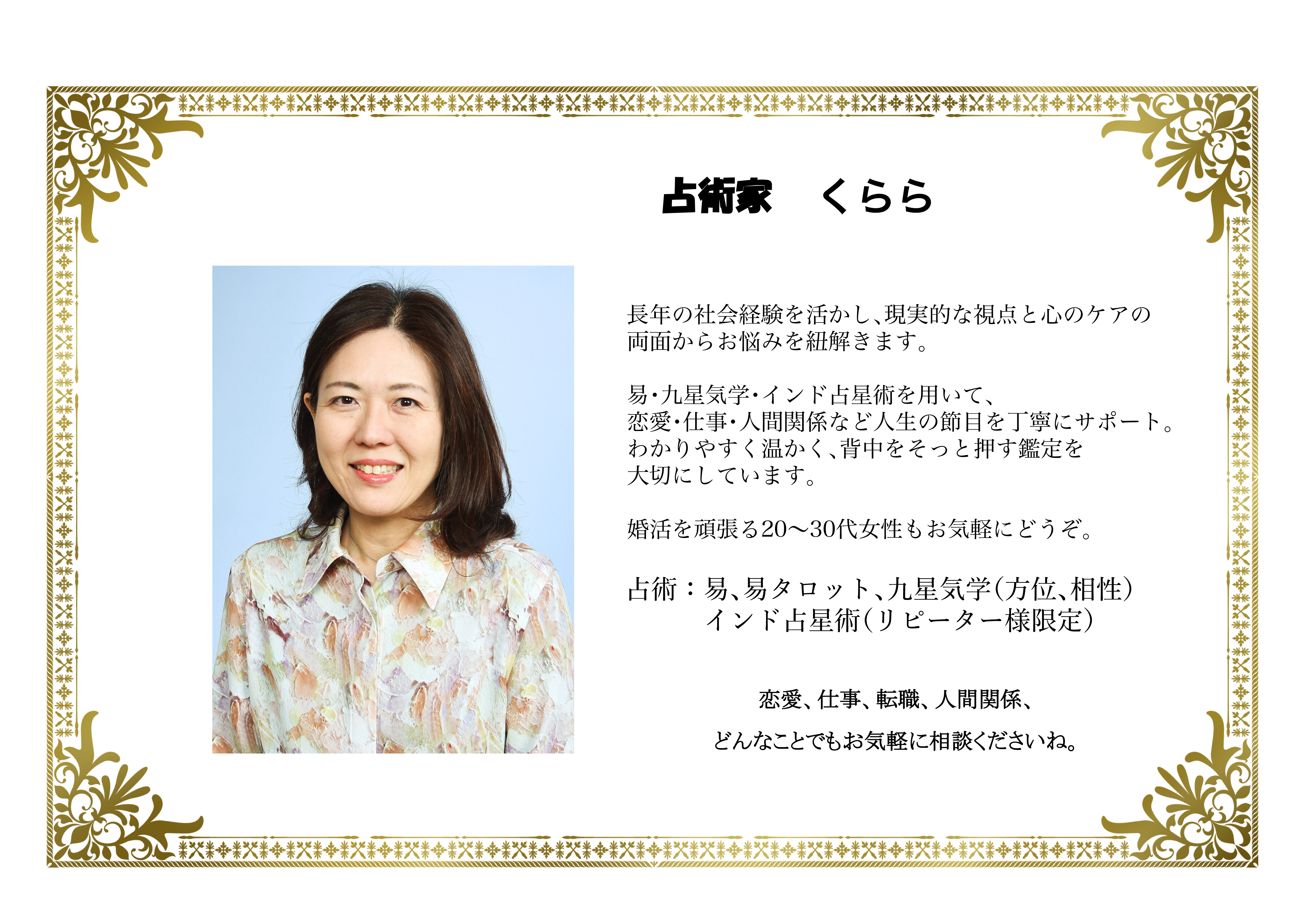 易・九星気学・インド占星術を用いて、恋愛・仕事・人間関係など人生の節目を丁寧にサポート。