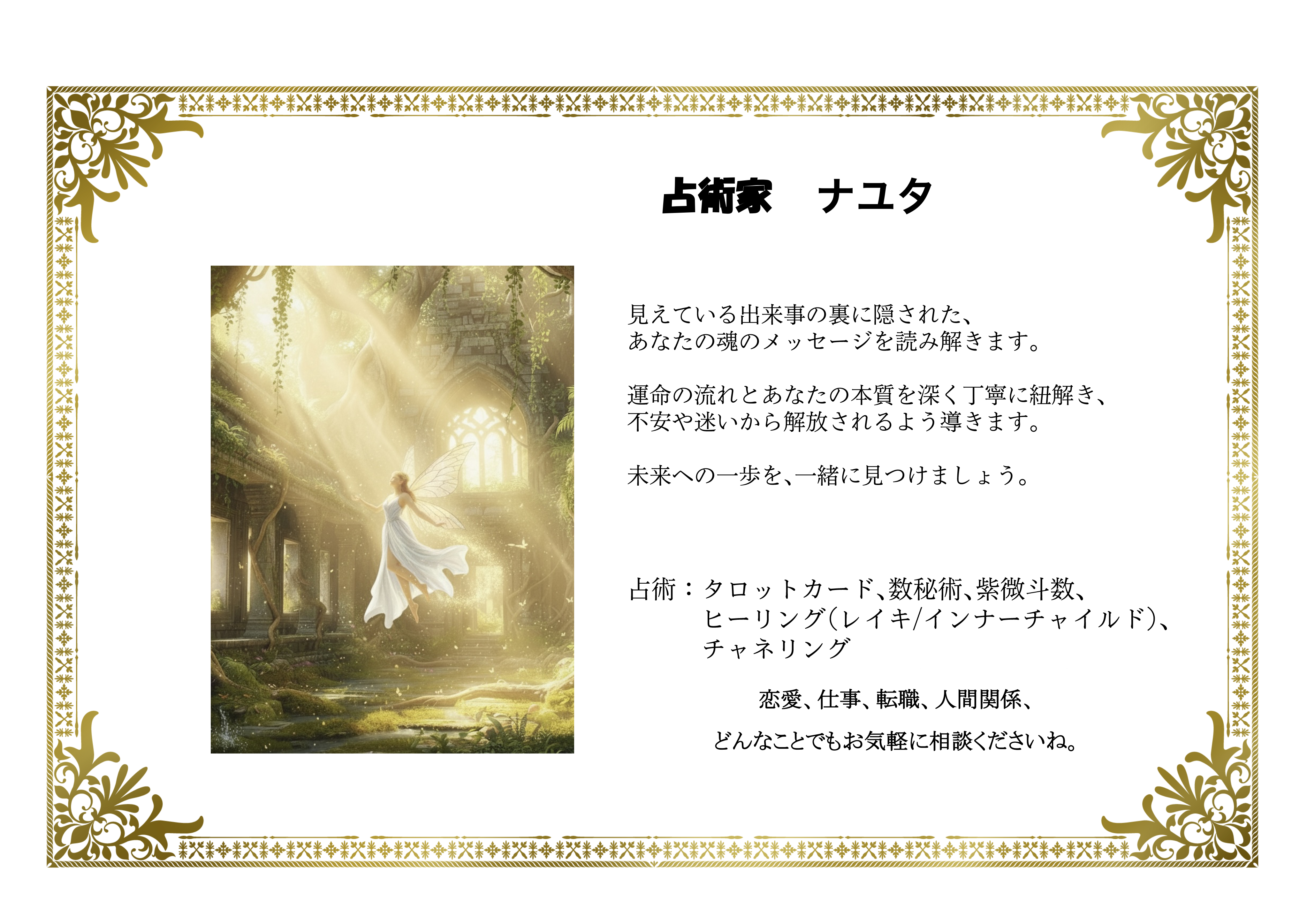 占術:タロットカード、数秘術、紫微斗数、ヒーリング(レイキ/インナーチャイルド)、チャネリング